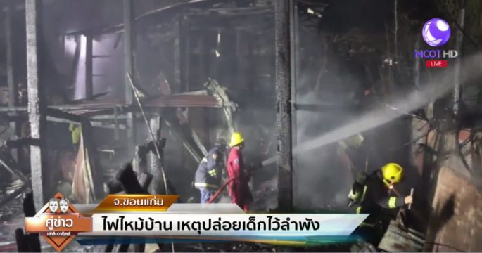 เหตุไฟไหม้บ้านไม้สองชั้นกลางเมืองขอนแก่น ก่อนลามไปบ้านข้างเคียงอีก 2 หลัง เหตุเกิดจากเด็กเล็กสองคน ที่อยู่บ้านเพียงลำพัง จุดไฟเล่น