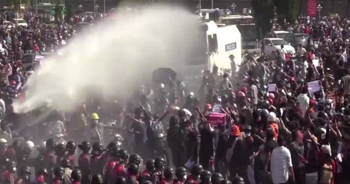 ตำรวจเมียนมาฉีดน้ำใส่กลุ่มต้านรัฐประหาร