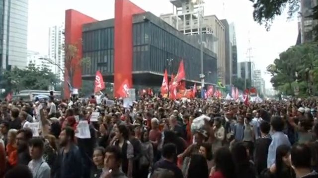 ตำรวจบราซิลยิงแก๊สน้ำตาสลายกลุ่มผู้ประท้วงหลายพันคนที่ชุมนุมต่อต้านการถอดถอนนางดิลมา รุสเซฟฟ์ ประธานาธิบดีฝ่ายซ้ายเมื่อวันอาทิตย์ที่ผ่านมา