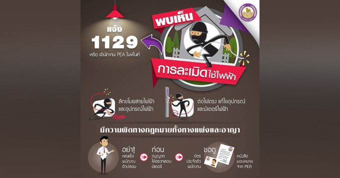 PEA เตือนประชาชนอย่าหลงเชื่อกลุ่มมิจฉาชีพที่ละเมิดการใช้ไฟฟ้าดัดแปลงแก้ไขอุปกรณ์ไฟฟ้าหรือ ลักลอบขโมยสายไฟฟ้า เพราะนอกจากต้องเสียค่าใช้จ่ายเพิ่มแล้ว ยังต้องชดใช้ค่าปรับค่าเสียหายทางตลอดจนเสียค่าใช้จ่ายอื่นๆ และถูกดำเนินคดีทั้งทางแพ่งและอาญา
