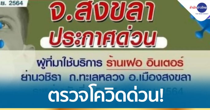 สำนักงานสาธารณสุขจังหวัดสงขลาประกาศด่วนให้ลูกค้าที่ใช้บริการร้านเฝอ อินเตอร์ ย่านวชิรา อ.เมืองสงขลา ระหว่าง 15-25 เม.ย. เข้ารับการตรวจคัดกรองหาเชื้อโควิด-19 วันพรุ่งนี้ หลังพบพนักงานร้านผู้ติดเชื้อโควิด 17 คน