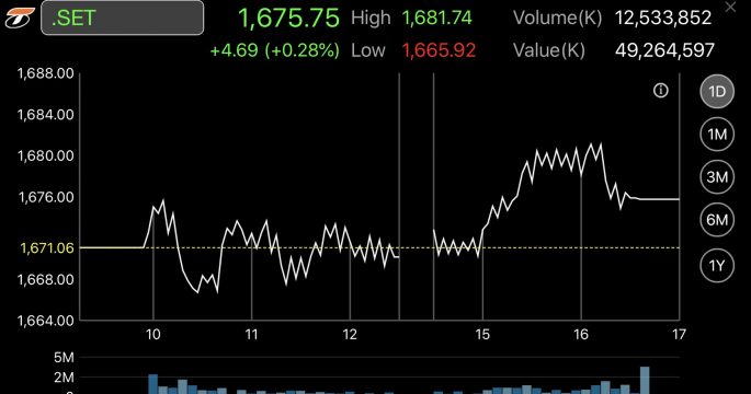 หุ้นไทยบวก 4.67 จุด แรงซื้อกลุ่มแบงก์-โรงกลั่น ดัชนีปิดที่ 1,680.96 จุด