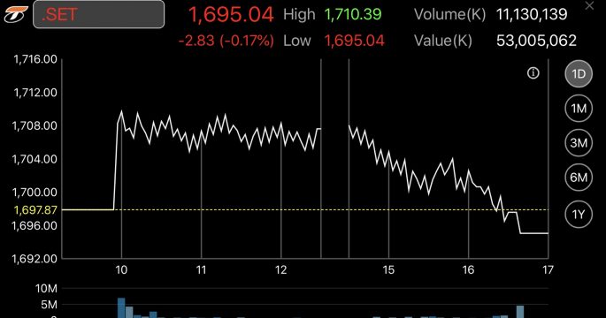 ดัชนีหุ้นไทยปิด 1,669.44 จุด ลบ 2.04 จุด กลุ่มแบงก์ขายหนี กนง.ลดดอกเบี้ย
