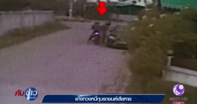 กล้องวงจรปิดจับภาพคนร้ายขี่ จยย.ซ้อน 2 มาแล้วจอดทุบรถยนต์ที่จอดอยู่ข้างทาง ก่อนหนีไปโดยไม่แตะต้องทรัพย์สินในรถ คาดเป็นกลุ่มเงินกู้นอกระบบ