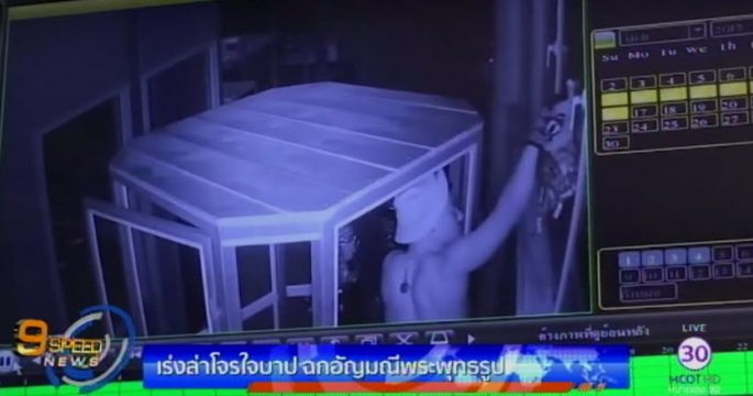 ภาพจากกล้องวงจรปิด ขณะชายคนหนึ่งปีนขึ้นเข้าไปในมณฑป ที่ประดิษฐานพระพุทธมหามณีนพรัตน์ ของวัดบุญศรีมุนีกรณ์ ย่านรามอินทรา ก่อนก่อเหตุถอดอัญมณีที่ประดับอยู่บนนิ้วโป้ง นิ้วชี้ และนิ้วก้อย รวม 3 เม็ด