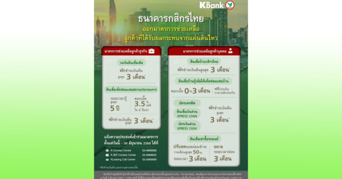 ธ.กสิกรไทย ออกมาตรการช่วยเหลือจากเหตุแผ่นดินไหว