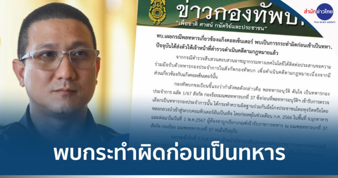 โฆษก ทบ. เผยกรณีพลทหารเกี่ยวข้องแก๊งคอลเซ็นเตอร์ พบเป็นการกระทำผิดก่อนเข้าเป็นทหาร ปัจจุบันได้ส่งตัวให้เจ้าหน้าที่ตำรวจดำเนินคดีตามกฎหมายแล้ว