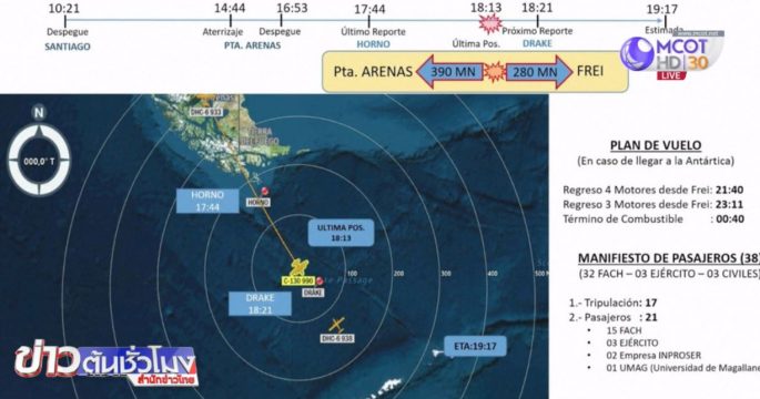 เจ้าหน้าที่กู้ภัยระดมกำลังค้นหาเครื่องบินลำเลียงของกองทัพอากาศชิลีที่สูญหายไปพร้อมลูกเรือ 17 คนและผู้โดยสาร 21 คน รวมทั้งหมด 38 คน ขณะมุ่งหน้าไปยังฐานทัพในทวีปแอนตาร์กติกา ทางขั้วโลกใต้ ก่อนสูญหาย