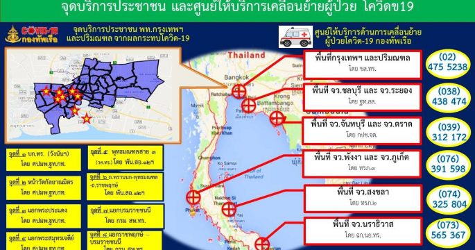กองทัพเรือ จัดตั้งศูนย์บริการเคลื่อนย้ายผู้ป่วยโควิด-19 ประจำพื้นที่รับผิดชอบในเขตกรุงเทพฯ ปริมณฑล และต่างจังหวัด