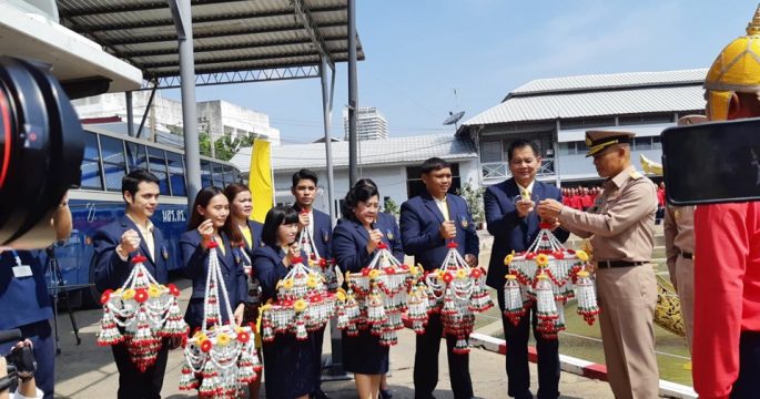 รร.สตรีวัดระฆัง ส่งมอบพวงมาลัยประดับเรือพระที่นั่ง ทั้ง 4 ลำในการเสด็จพระราชดำเนินเลียบพระนครฯ ให้กรมอู่ทหารเรือ ก่อนติดตั้งในวันซ้อมใหญ่ 17 ต.ค.นี้
