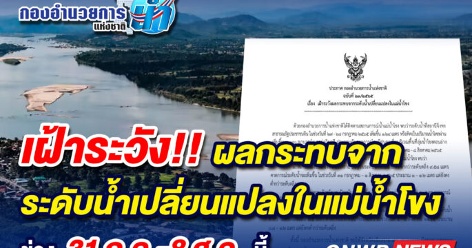 กองอำนวยการน้ำแห่งชาติออกประกาศแจ้งเตือนให้เฝ้าระวังระดับน้ำแม่น้ำโขงที่อาจสูงขึ้น 1-2 เมตรระหว่างวันที่ 14-18 ส.ค. นี้ ซึ่งเป็นการออกประกาศต่อเนื่อง หลังจากเพิ่งออกประกาศไปเมื่อ 2 วันที่ผ่านมา โดยระดับน้ำที่แจ้งเตือนตามประกาศฉบับใหม่สูงกว่าที่แจ้งเตือนตามประกาศฉบับก่อนหน้า แต่ยืนยันว่า ยังคงต่ำกว่าตลิ่ง