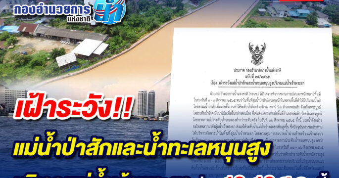 กองอำนวยการน้ำแห่งชาติออกประกาศเฝ้าระวังแม่น้ำป่าสักเนื่องจากฝนตกหนัก ล่าสุดแม่น้ำป่าสักล้นตลิ่งในอ. หล่มสัก จ. เพชรบูรณ์ นอกจากนี้ยังต้องเฝ้าระวังภาวะน้ำทะเลหนุนสูงวันที่ 10 – 16 สิงหาคมซึ่งอาจทำให้ระดับน้ำแม่น้ำเจ้าพระยาสูงประมาณ 1.80 – 2.10 เมตรจากระดับน้ำทะเลปานกลาง