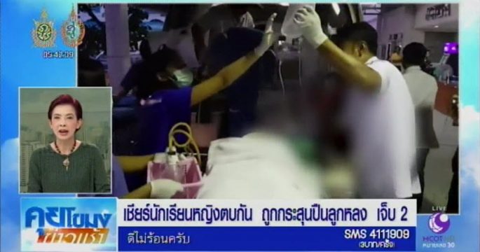 นักเรียนหญิง 2 กลุ่ม ยกพวกตบกัน อีกฝ่ายสู้ไม่ได้ ก่อนมีเสียงปืนดังขึ้น วัยรุ่นชายที่มามุงโดนลูกหลง บาดเจ็บ 2 ราย