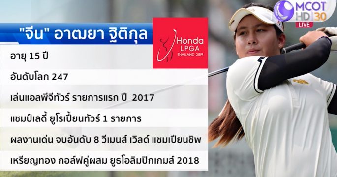 กอล์ฟฮอนด้า แอลพีจีเอ ไทยแลนด์ 2019 ระหว่างวันที่ 21 – 24 กุมภาพันธ์นี้ มีนักกอล์ฟหญิงระดับโลกเข้าร่วมดวลวงสวิงกว่า 70 คน ชิงเงินรางวัลรวมกว่า 53 ล้านบาท ซึ่งช่อง 9 MCOT HD หมายเลข 30 จะพาไปรู้จักนักกอล์ฟหญิงที่มีผลงานโดดเด่น โดยวันนี้ ไปพบกับ “น้องจีน” อาฒยา ฐิติกุล