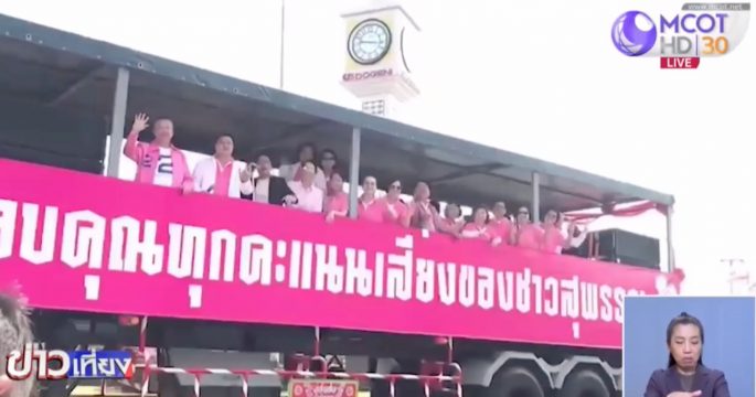 หัวหน้าพรรคชาติไทยพัฒนา และแกนนำพรรค ขึ้นรถแห่ขอบคุณชาวสุพรรณบุรี หลังผลคะแนนการเลือกตั้งอย่างไม่เป็นทางการ สามารถปักธงได้ ส.ส. ทั้ง 4 เขต