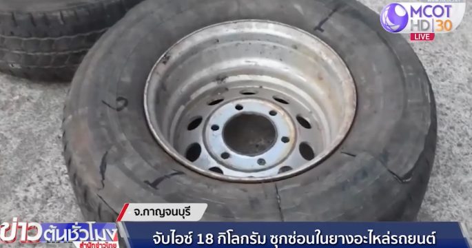 ตำรวจ สภ.ทองผาภูมิ ตรวจสอบยางอะไหล่รถยนต์ ที่ตกหล่นอยู่กลางถนนสายทองผาภูมิ-ปิล๊อก พบไอซ์ซุกซ่อนอยู่ภายในล้อยาง จำนวน 18 กิโลกรัม