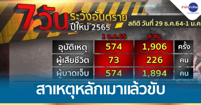 7 วันอันตรายปีใหม่ เมาแล้วขับยังเป็นสาเหตุหลักของการเกิดอุบัติเหตุ ขณะที่ยอดรวม 4 วัน บาดเจ็บเกือบ 1,900 คน เสียชีวิต 226 คน