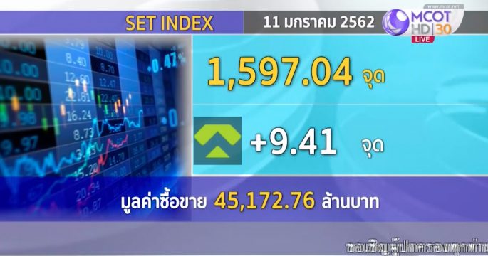 ดัชนีตลาดหุ้นไทยปิดการซื้อขายวันนี้(11 ม.ค.) ที่ระดับ 1,597.04 จุด เพิ่มขึ้น 9.41 จุด หรือร้อยละ 0.59 มูลค่าการซื้อขาย 45,172.76 ล้านบาท