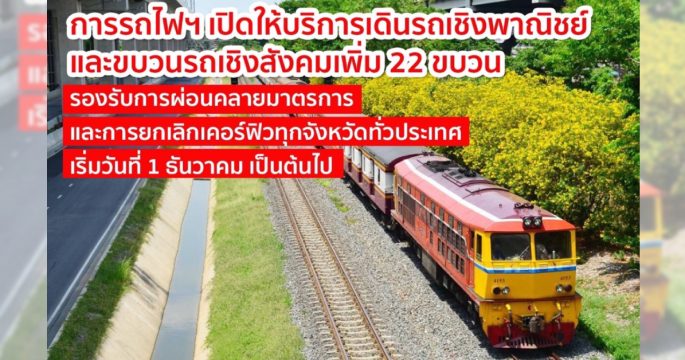 การรถไฟฯ เปิดให้บริการเดินรถเชิงพาณิชย์และขบวนรถเชิงสังคมเพิ่ม 22 ขบวน รองรับการผ่อนคลายมาตรการและการยกเลิกเคอร์ฟิวทุกจังหวัดทั่วประเทศ เริ่มวันพรุ่งนี้ (1 ธ.ค.)