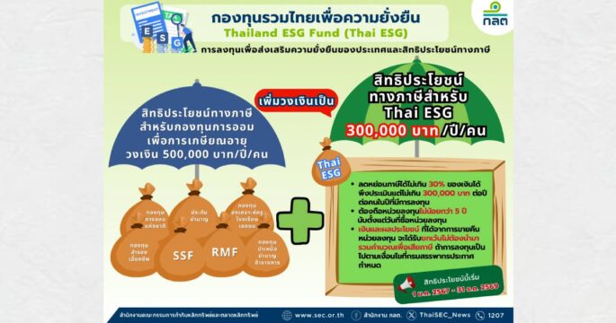ก.ล.ต.สนับสนุนกองทุน Thai ESG เพิ่มทางเลือกลงทุน พร้อมลดหย่อนภาษีได้ ปีภาษี 2567-2569 ได้ เพิ่มจาก 100,000 บาท เป็นไม่เกิน 300,000 บาทต่อปีต่อคน
