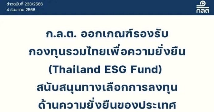 กรุงเทพฯง 4 ธ.ค.-ก.ล.ต. ออกแล้วเกณฑ์รองรับกองทุนรวมไทยเพื่อความยั่งยืน (Thailand ESG Fund) โดย 22 กองทุน จาก บลจ. 16 แห่ง พร้อมขาย 8 ธ.ค. สนับสนุนทางเลือกการลงทุนด้านความยั่งยืนของประเทศ