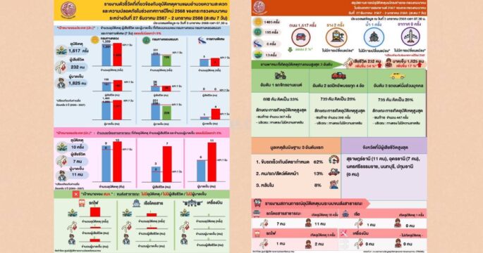 คมนาคมเผยตัวเลขภาพรวมการเดินทางปีใหม่ 2568 รวม 7 วัน พบการเดินทางลดลง 7.72% – อุบัติเหตุลดลง 2.29% ส่วนใหญ่เกิดจากขับเร็วเกินกำหนด พร้อมรับประชาชนเดินทางกลับด้วยความสะดวก – ปลอดภัย ขอความร่วมมือประชาชนขับขี่ด้วยความระมัดระวัง – เคารพกฎจราจรอย่างเคร่งครัด