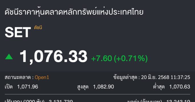 กรุงเทพฯ 20 มิ.ย. – หุ้นไทยรีบาวน์ 10 จุด หลังแรงกดดันการเมืองชะลอลง จับตาท่าทีสหรัฐต่อสงครามอิสราเอล-อิหร่าน ส่วนเงินบาทยังแข็งค่าเล็กน้อย ผู้สื่อข่าวรายงานภาวะหุ้นไทยวันนี้ เปิดตลาดภาคเช้าวันที่ 20 มิ.ย. 68 ที่ระดับ 1,071.96 จุด เพิ่มขึ้น 3.23 จุด โดยล่าสุดเวลา 11.37 น. ดัชนีหุ้นไทยอยู่ที่ 1,076.33 จุด เพิ่มขึ้น 7.60 จุด หรือ 0.71% มูลค่าซื้อขาย 13,243.19 ล้านบาท ดัชนีสูงสุด 1,082.90 จุด เพิ่มขึ้น 10.94 จุด ต่ำสุด 1,070.63 จุด นายชัยยศ จิวางกูร ผู้อำนวยการฝ่ายวิเคราะห์หลักทรัพย์ บล.กรุงศรี ให้สัมภาษณ์ในรายการนาทีลงทุน ช่อง 9 MCOT HD ยอมรับปัจจัยทางการเมืองยังเป็นแรงกดดันตลาดหุ้น แต่ไม่มากเท่าในช่วง […]
