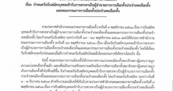 กกต.เปิดรับสมัคร ผอ.-กก.ประจำเขตเลือกตั้ง 3-7 ธ.ค.นี้ เพื่อเตรียมพร้อมจัดการเลือกตั้ง ส.ส. หลัง กกต.ประกาศเขตเลือกตั้ง