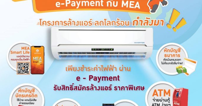 โครงการล้างแอร์กำลังมา เพียงชำระค่าไฟฟ้าผ่าน e-Payment ช่องทางใดก็ได้ รับสิทธิสมัครล้างแอร์ลดโลกร้อนกับ MEA ในราคาพิเศษ