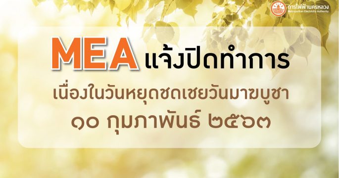 MEA จะปิดทำการทุกแห่งเนื่องในวันหยุดชดเชยวันมาฆบูชา ในวันจันทร์ที่ 10 กุมภาพันธ์ 2563 ยกเว้นเคาน์เตอร์ที่ศูนย์บริการภาครัฐแบบเบ็ดเสร็จ (Government Center) 3 แห่ง