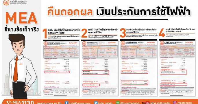 MEA ชี้แจงข้อเท็จจริงเกี่ยวกับการคืนดอกผลเงินการประกันการใช้ไฟฟ้าของ MEA ต้องเป็นผู้ใช้ไฟฟ้าในเขตกทม. นนทบุรี และสมุทรปราการ และขอใช้ไฟฟ้าประเภทบ้านที่อยู่อาศัย, กิจการขนาดเล็ก และมีชื่อผู้วางหลักประกันตรงกับชื่อผู้ขอใช้ไฟฟ้าเท่านั้น