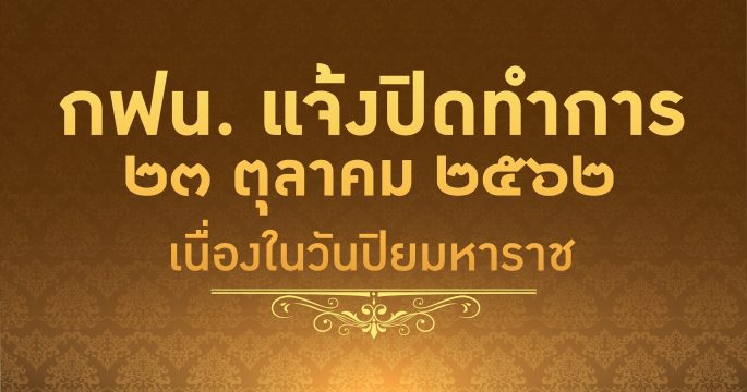 การไฟฟ้านครหลวง (MEA) แจ้งปิดทำการทุกแห่งเนื่องในวันปิยมหาราช ในวันวันพุธที่ 23 ตุลาคม 2562 ยกเว้นเคาน์เตอร์ที่ศูนย์บริการภาครัฐแบบเบ็ดเสร็จ (Government Center) ที่เปิดทำการพร้อมให้บริการชำระค่าไฟฟ้าปกติ 3 แห่ง