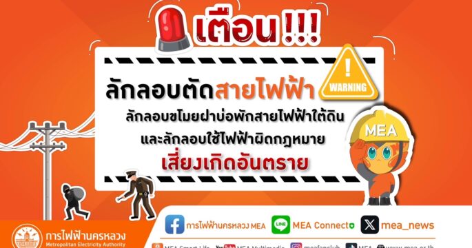 กรุงเทพฯ 1 มี.ค.-MEA หรือการไฟฟ้านครหลวง เตือนลักลอบตัดสายไฟฟ้า ลักลอบขโมยฝาบ่อพักชั่วคราวที่ใช้วางท่อร้อยสายไฟฟ้าใต้ดิน และลักลอบใช้ไฟฟ้าผิดกฎหมาย ไม่ปลอดภัยเสี่ยงเกิดอันตราย
