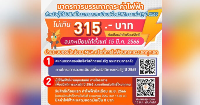 MEA แจ้งผู้มีสิทธิ์สวัสดิการแห่งรัฐที่ยังไม่เคยลงทะเบียนรับสิทธิ์มาตรการบรรเทาภาระค่าไฟฟ้า สามารถลงทะเบียนได้ต่อเนื่อง