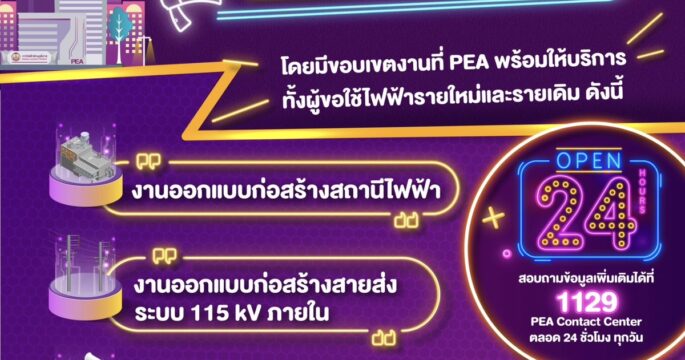 การไฟฟ้าส่วนภูมิภาค (PEA) ให้บริการขอใช้ไฟฟ้าระบบ 115-230 kV ทั้งผู้ใช้ไฟฟ้ารายใหม่และรายเดิม แบบ One Stop Service ที่สำนักงานใหญ่
