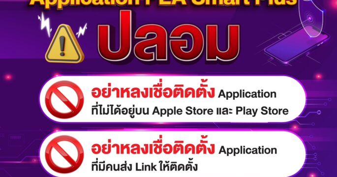 การไฟฟ้าส่วนภูมิภาค (PEA) พบว่ามีการหลอกลวงให้ติดตั้ง Application PEA Smart Plus ดังนั้น จึงขอเตือนประชาชนไม่ควรหลงเชื่อติดตั้ง Application จากผู้ที่ส่ง Link มายังท่าน หรือจากเว็บไซต์อื่นที่ไม่ใช่เว็บไซต์ของการไฟฟ้าส่วนภูมิภาค