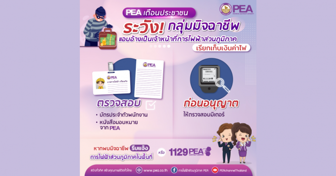 PEA เตือนระวังกลุ่มมิจฉาชีพ แอบอ้างเป็นเจ้าหน้าที่การไฟฟ้าส่วนภูมิภาค เรียกเก็บเงินค่าไฟ หากพบให้รีบเเจ้ง การไฟฟ้าส่วนภูมมิภาคในพื้นที่ หรือ 1129 PEA Contact CENTER