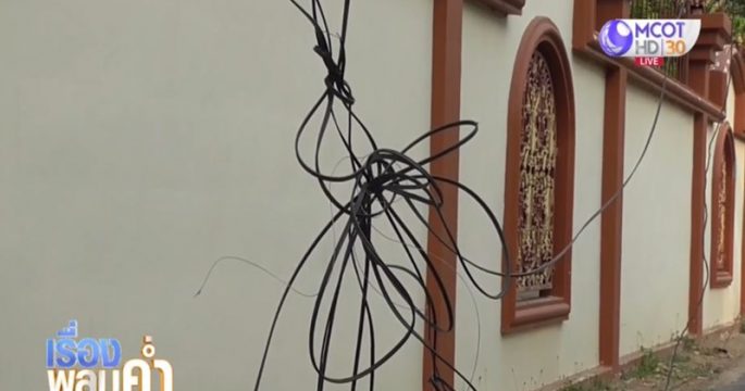 เจ้าของบ้านโวยสายไฟและสายสื่อสารห้อยระโยงเต็มกำแพงบ้านยาวกว่า 300 เมตร หวั่นเกิดอันตราย เผยนอนไม่หลับจนเครียด วอนแก้ไขด่วน