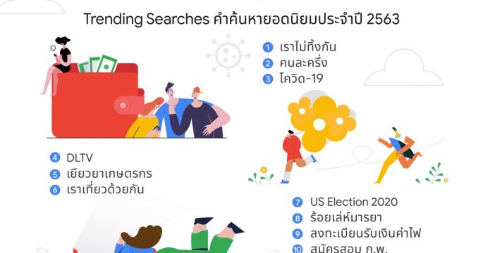 กรุงเทพฯ 9 ธ.ค. -กูเกิลประกาศคำค้นหายอดนิยมประจำปี 2563 โดยแสดงให้เห็นถึงภาพรวมของทั้งปีที่ผ่านมา  สถานการณ์โควิด-19 ได้ส่งผลกระทบต่อความเป็นอยู่และการดำเนินธุรกิจของประชาชนทั้งประเทศ ส่งผลให้คนไทยตอบรับกับโครงการที่รัฐบาลมีนโยบายออกมาช่วยเยียวยาประชาชนทั้งเพื่อลดรายจ่ายและช่วยฟื้นฟูกระตุ้นเศรษฐกิจทำให้ 5 ใน 10 ของคำค้นหายอดนิยมปีนี้มาจากโครงการของรัฐบาล ได้แก่ “เราไม่ทิ้งกัน” “คนละครึ่ง” “เยียวยาเกษตรกร” “เราเที่ยวด้วยกัน” และ “ลงทะเบียนรับเงินค่าไฟ”   ตลอดปีนี้ผู้คนยังคงให้ความสนใจค้นหาข้อมูลการแพร่ระบาดของโควิด-19 อย่างต่อเนื่อง โดย “โควิด-19” ติดอันดับ3 และนับเป็นครั้งแรกที่การค้นหาด้านการศึกษาติดอันดับ 2 ใน 10 ได้แก่ “DLTV” และ “สมัครสอบ ก.พ.” ส่วนการค้นหาข่าวการเมืองที่ทั่วโลกต่างจับตามอง โดย “US Election 2020” ก็ติดอยู่ในโผคำค้นหายอดนิยมด้วยเช่นกัน นอกจากนี้ ผลจากสถานการณ์การแพร่ระบาดของโควิด-19 ยังทำให้เห็นถึงการเปลี่ยนแปลงพฤติกรรมความสนใจค้นหาของผู้คนในการทำกิจกรรมผ่านออนไลน์เพื่อตอบสนองไลฟ์สไตล์ได้อย่างชัดเจน โดย “เรียนออนไลน์” “ลอยกระทงออนไลน์” “ยื่นภาษีออนไลน์” “เวียนเทียนออนไลน์” และ “อบรมใบขับขี่ออนไลน์” ติดโผอันดับ  1 -5 ตามลำดับ   ด้านข่าวเด่นในปีนี้ ผู้คนให้ความสนใจต่อเหตุการณ์ใหญ่ๆ ที่เกิดขึ้นค่อนข้างหลากหลาย โดยการค้นหาคำที่เกี่ยวข้องกับโรคระบาดและสุขภาพติดอันดับ 1 คือ “โควิค-19” ด้าน “ไวรัส RSV” ติดอันดับที่ 4 ส่วนข่าวด้านการเมืองระดับโลกติดอันดับที่ 2 คือ “US Election 2020” ด้านข่าวคดีสะเทือนขวัญและอุบัติเหตุที่คนไทยทั้งประเทศให้ความสนใจติดตามค้นหาติดอันดับ 4 ใน 10 ได้แก่ “ข่าวน้องชมพู่” “กราดยิงโคราช” “โจรปล้นทอง” และ “รถไฟชนรถบัส” รวมทั้ง ข่าวปรากฏการณ์ทางธรรมชาติ ได้แก่ “สุริยุปราคา 2563” และข่าวภัยธรรมชาติ “พายุเข้าไทย” ก็ติดอันดับในปีนี้ด้วยเช่นกัน ด้านหมวดสถานที่ท่องเที่ยว เนื่องจากสถานการณ์โควิด-19 ทำให้ผู้คนต้องระงับการเดินทางท่องเที่ยวต่างประเทศในช่วงปีนี้ ส่งผลให้คนไทยหันมาสนใจค้นหาสถานที่ท่องเที่ยวในประเทศที่มีบรรยากาศของความเป็นธรรมชาติเป็นภูเขาและมีอากาศที่เย็นสบายแทน ได้แก่ “เชียงใหม่” “เชียงราย” “เขาค้อ” และ “กาญจนบุรี” ส่วนสถานที่ท่องเที่ยวที่มีบรรยากาศแบบทะเลและชายหาดที่สวยงามที่ติดโผในปีนี้ ได้แก่ “สุราษฎร์ธานี” “พัทยา” “หัวหิน” “ประจวบคีรีขันธ์” “ระนอง” และ “ระยอง”  ส่วนในหมวด “วิธี” ปีนี้ คนไทยให้ความสนใจค้นหาวิธีต่างๆ เพื่อให