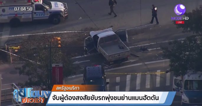 ตำรวจนิวยอร์กคุมตัวผู้ต้องสงสัยขับรถพุ่งชนผู้คนบนทางเดินทางและเลนจักรยาน ย่านโลวเวอร์ แมนฮัตตัน ในวันฮัลโลวีน มีเสียชีวิตอย่างน้อย 8 คน บาดเจ็บจำนวนมาก ชี้เป็นการก่อการร้าย