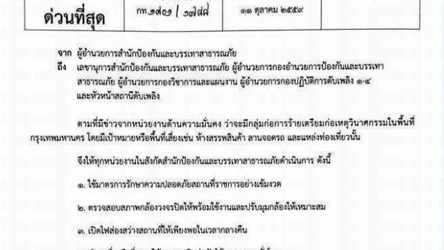 กทม.สั่งเจ้าหน้าที่พร้อมรับเหตุวินาศกรรม ชี้จุดเสี่ยง ห้าง-ลานจอดรถ-แหล่งท่องเที่ยว กำชับคุมเข้มหน่วยราชการ ตรวจกล้องให้ใช้งานได้