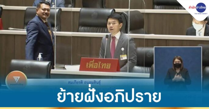 “สมเกียรติ ถนอมสินธุ์” สวมเนคไทแดง ยืนอภิปราย หน้าป้ายพรรคเพื่อไทย กลางสภาฯ คาดย้ายเข้าเพื่อไทย หลังก้าวไกล ไม่ส่งลงสมัครเลือกตั้ง ส.ส. สมัยหน้า