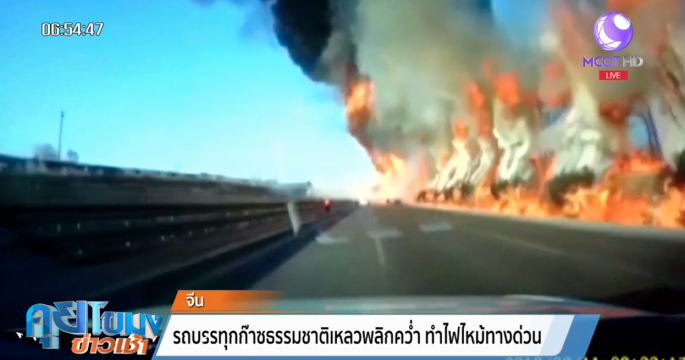 เผยคลิปรถบรรทุกก๊าซธรรมชาติเหลว หรือ LNG ระเบิดไฟลุกท่วมหลังเกิดอุบัติเหตุเสียหลักพลิกคว่ำที่ประเทศจีน