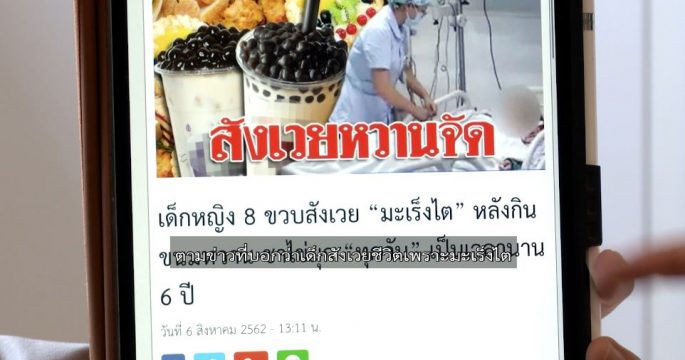 สื่อสังคมออนไลน์มีการแชร์ข่าวว่า เด็กหญิงวัย 8 ขวบ สังเวยมะเร็งไต หลังจากกินขนมหวาน ชานมไข่มุก ทุกวันเป็นเวลานาน 6 ปี เรื่องนี้จริงหรือไม่ ? ติดตามจากศูนย์ชัวร์ก่อนแชร์