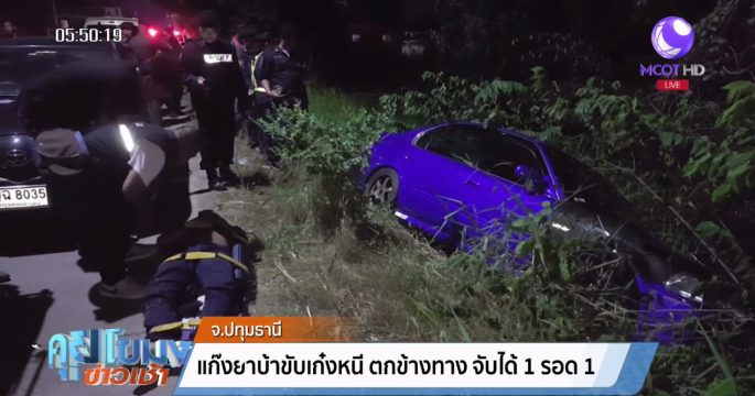 เก๋งขนยาเสพติดไหวตัวทันพุ่งชนรถสืบสวนเสียหาย 2 คัน แต่ไปไม่รอดเสียหลักตกข้างถนนปทุมธานี-สามโคก (สายใน) จ.ปทุมธานี บาดเจ็บ 1 ราย ส่วนอีกคนหนีเข้าป่า
