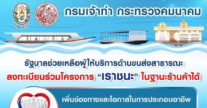 กรมเจ้าท่า ร่วมสนับสนุนนโยบายรัฐบาล และช่วยเหลือผู้ให้บริการด้านขนส่งสาธารณะ ลงทะเบียนร่วมโครงการ “เราชนะ” ให้มีฐานะร้านค้าได้ เพิ่มช่องทางและโอกาสประกอบอาชีพ ลงทะเบียนทาง www.เราชนะ.com ตั้งแต่วันที่ 29 ม.ค.-31 มี.ค.64
