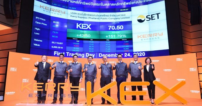 บริษัทเคอรี่ เอ็กซ์เพรส (ประเทศไทย) จำกัด (มหาชน) หรือ “KEX” เข้าทำการซื้อขายในตลาดหลักทรัพย์วันแรก (24 ธันวาคม 63) ราคาพุ่งอยู่ที่ 72.25 บาท เหนือจอง 158% จากราคา IPO 28 บาท/หุ้น พร้อมเดินหน้าดันศักยภาพขนส่งเป็น 3 ล้านชิ้นต่อวันภายในปี 2566