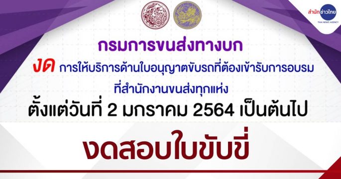 ขนส่งทางบก งดการอบรมและทดสอบเพื่อขอรับใบอนุญาตขับรถและผู้ประจำรถรายใหม่ ณ สำนักงานขนส่งทุกแห่ง ตั้งแต่วันที่ 2 มกราคม 2564 เป็นต้นไป จนกว่าจะมีประกาศเปลี่ยนแปลง