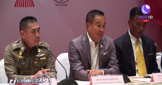 พล.ต.อ.จักรทิพย์ ชัยจินดา ผบ.ตร. พล.ต.อ.สมยศ พุ่มพันธุ์ม่วง นายกสมาคมกีฬาฟุตบอลฯ ร่วมกันแถลงข่าวปราบขบวนการล้มบอลไทย ที่สตช.