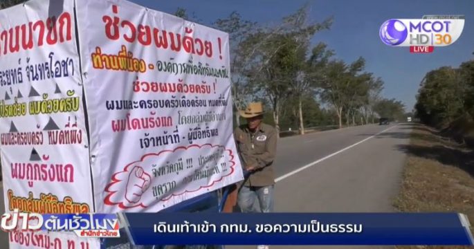 ชายชาวเชียงใหม่วัย 59 ปี เดินเท้าถึง จ.ลำปาง แล้ว หลังออกจาก จ.เชียงใหม่ ตั้งแต่เช้าวันที่ 18 ธ.ค. มุ่งหน้าเข้ากรุงเทพฯ เพื่อยื่นหนังสือขอความเป็นธรรมกับนายกรัฐมนตรี หลังถูกนายทุนฟ้องร้อง